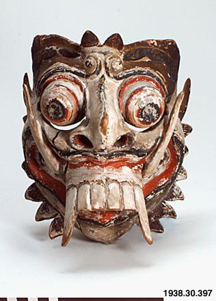 Mask av skuret och bemålat trä. Masken har demonansikte med stora , runda, stirrande ögon, långa, utstickande hörntänder och en utskjutande överkäke. Masken föreställer Rangda.