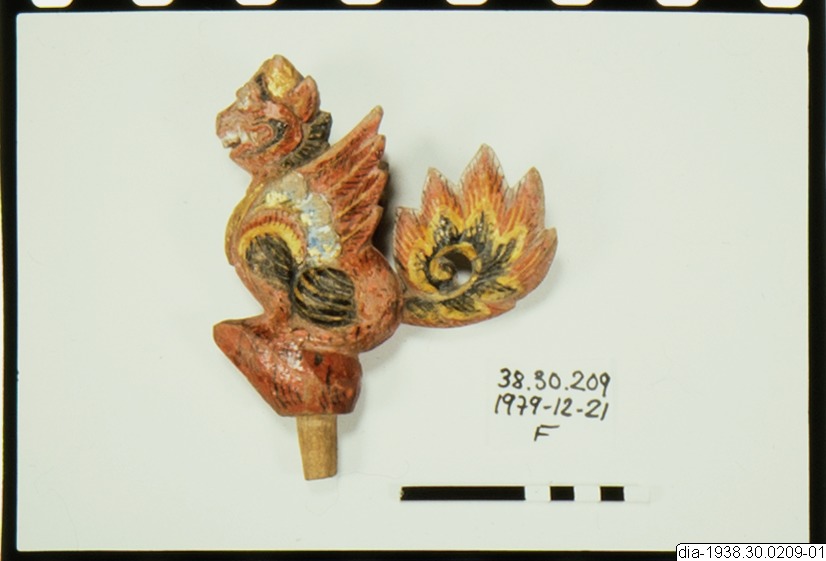 Prydnadspropp till flaska av skuret och bemålat trä. Proppen föreställer det mytologiska djuret singa, ett bevingat lejon med demonhuvud. Svansen har varit lös men är fastsatt med spikar.