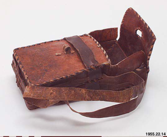 Se bild i samling 44, bildarkivet (Jonas Iwarssons samling från 1907) som föreställer en debtera*bärande på bland annat en manuskriptväska av samma slag som denna. Nederst på bilden står det skrivet på italiensk - "Abba Ghabré. Prete Mendicante."