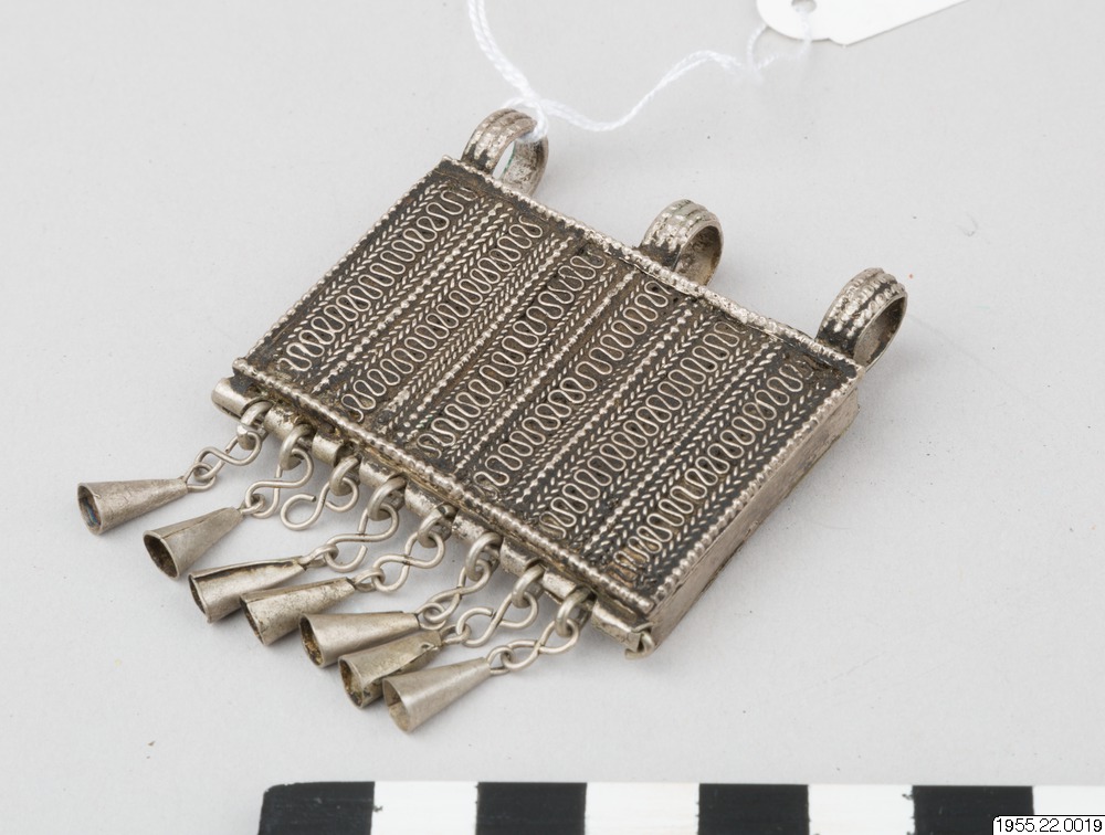 Halsband utformat som en amulettask tillverkad i silver. Halsbandet har tre öglor upptill, där ett snöre ska träs, och sju små rasslande klockor längs nederkanten (en av de åtta klockorna saknas). Framsidan är rikligt ornerad med granulation- och filigranteknik.