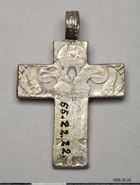 Litet kors med ögla för upphängning, tillverkat av en Maria Theresia -taler*. Myntets prägling finns delvis bevarat.