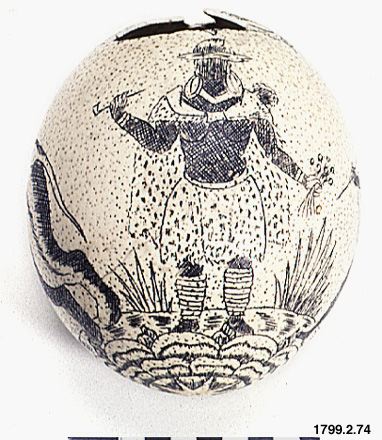 Strutsägg med inristat motiv. Stutsskal har historiskt använts som vattenkrus i Sydafrika. Mynningen utgörs av ett hål som skärs ut i ena änden eller i sidan av ägget, ibland är skalen dekorerade. Motivet på detta strutsägg liknar dock inte de vanliga motiven; "The engravings show a Hottentott warrior, a Hottentott woman with her child, an elephant, a tree and some grass. Both ends of the egg are decorated with flowers and a star pattern, that recalls European peasant art from the 18th centutry". (Rudner.1957,s.10)