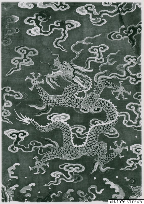 Kinesiska dräkter kan grundindelas i formella och mindre formella dräkter. Denna dräkt går under den så välkända benämningen drakdräkt ("dragon robe", kin."longpao" eller "mangpao" beroende på antalet klor), d.v.s. den tillhör kategorin "festivitetsdräkter" (Siggstedt 1995, s. 21) eller "jifu" för män (och även för kvinnor, men med vissa skillnader), vilket är mindre formella dräkter till skillnad från "hovdräkten" eller "chao fu". Båda typer kan bestå av drakmönstrade dräkter, men skiljer sig bl. a. genom att hovdräkten har en veckad nederdel. Drakdräkten är alltså snävare och detta brukar anses som ett typiskt drag hos Qing-dynastins mansdräkter (arvet från nomaddräkten, Siggstedt 1995 s. 22). Symboliken både på drakdräkten och hovdräkten är av kosmologisk typ, d.v.s. just det vi ser här: drakar, himmel, berg, himmel och vatten (det s.k. "lishui"-mönstret, stående vågor). Vanligtvis var drakarna till antalet nio stycken. Den fyrkloiga draken (oftast kallad "mang"-drake) ansågs principiellt vara ämbetsmannens enligt dräktförordningarna tillåtna drake. Den femkloiga ("long"-draken) skulle då vara kejsarens signum, men märkligt nog dominerar dessa bland Qing-dräkterna (Siggstedt 1995, s. 29). Utbudet av femkloiga drakdräkter är ju också stort på all världens museer. Cammann 1952 skriver på s. 32: "Obviously, the popular myth that the five-clawed dragon was always restricted to the Ch´ing Emperors is utterly without foundation." (PH)
