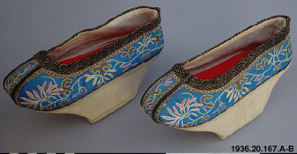 Skorna har som nämnts en typisk utformning för en manchu-dam. Skorna visar indirekt på Qing-dynastins regelverk för klädseln. Manchuerna var ju den styrande gruppen och manchu-kvinnor var tvungna att följa dräktreglerna, till skillnad från han-kvinnorna. Manchu-kvinnor fick t ex inte binda fötterna eller bära vid, tvådelad dräkt, som var typiskt för han-kinesiskor. (Siggstedt 1995, s. 37).