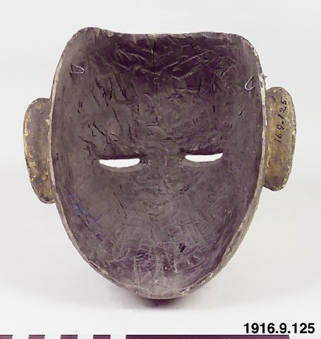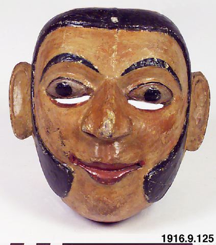 - Gult runt ansikte med bred näsa och svart skägg. Höjd: 19 cm. Bredd: 19 cm.