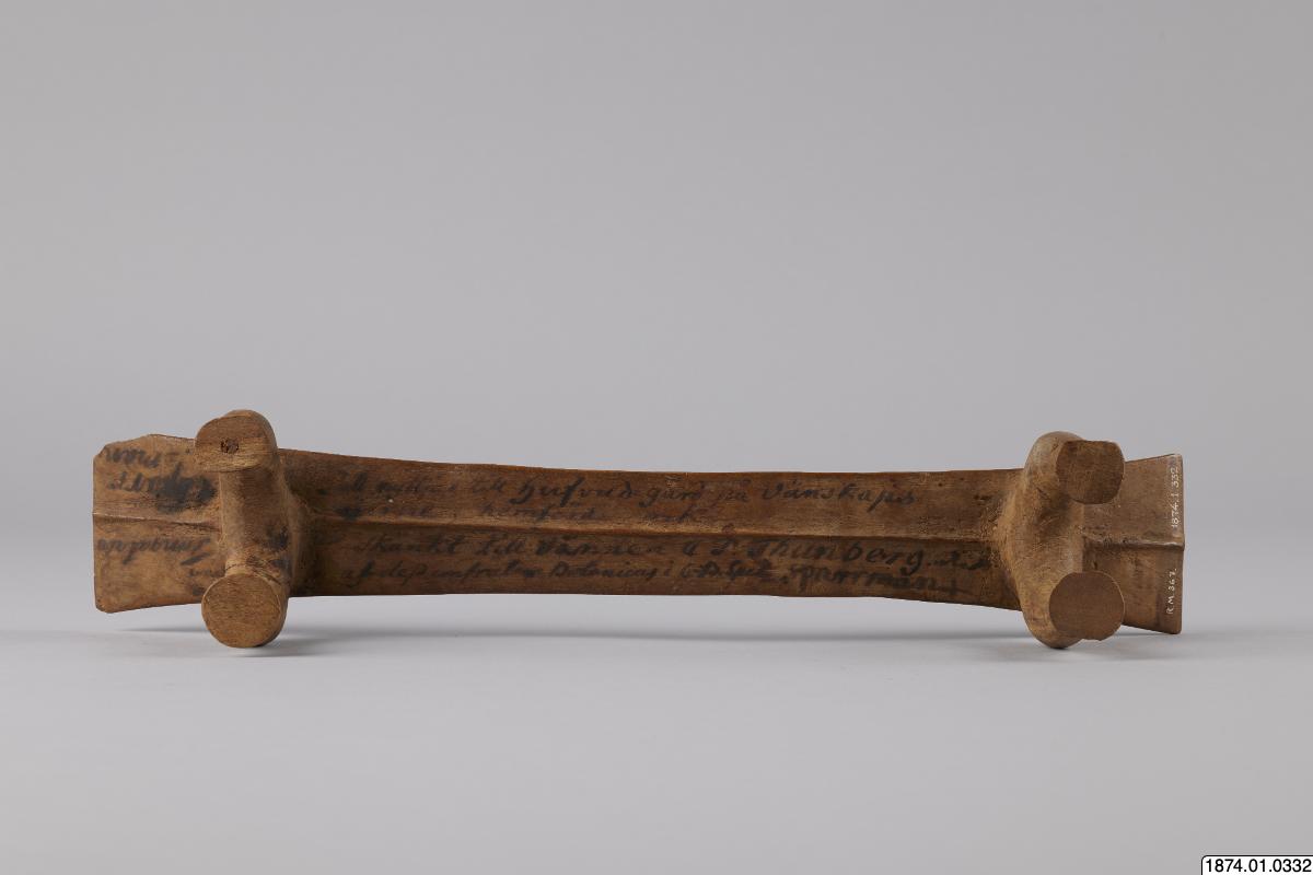 Nackpallen kommer från Tonga där Anders Sparrman liksom öborna själva använde en pall att lägga huvudet på vid sovdags. Han skänkte den till Thunberg med en dedikation som är skriven på pallens undersida "Pall nyttjad till hufvud-gärd på Vänskapsöarne, hemförd och skänkt till Vännen C. P. Thunberg af dess confrater Botanicus i C.-B. Spei. Sparrman".
