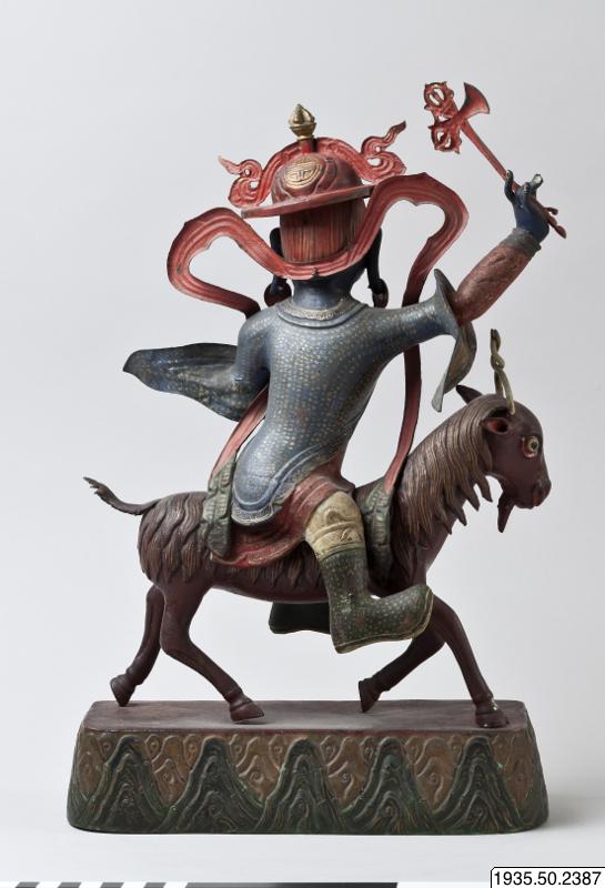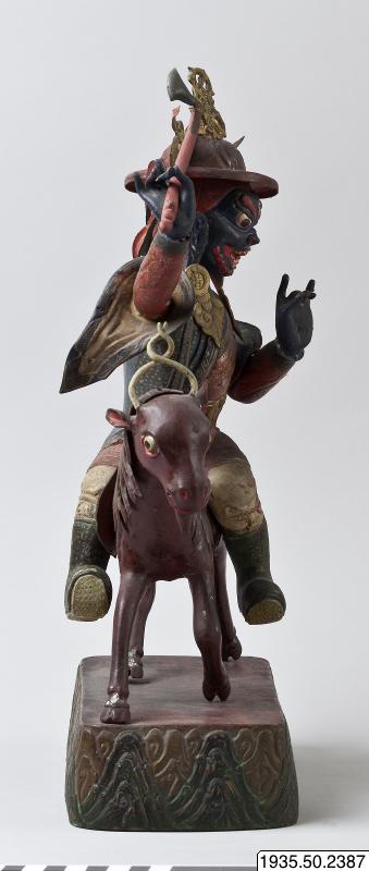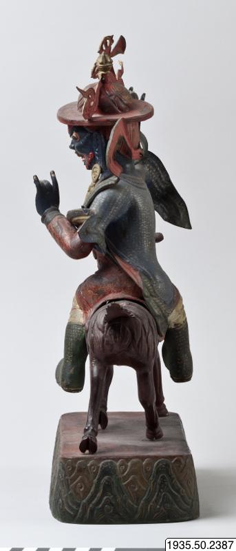 Kropp: Mörkblå hudfärg, två ben, två armar, ett huvud med skräckinjagande uppsyn och ett tredje vertikalt öga i pannan. Munnen grinande. Rött hår. Iklädd plattbrättad röd hatt med kulle krönt med gyllene band och en Vajra. Kullens fram- och baksida med stilicerat shou-tecken för långt liv. Långt, grönt, komplett stolaband fallande ned från axlarna. Bär hjärtformade örhängen i guld, mörkblå väst med guldornament, röd omlottlagd långskjorta knuten med gyllene bälte och rosett på magen; vita byxor, gröna stövlar.