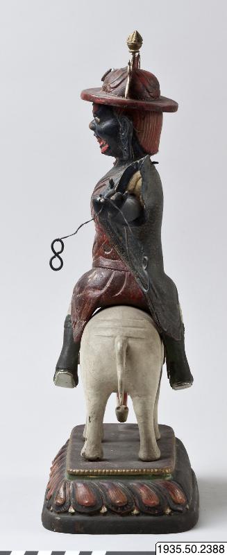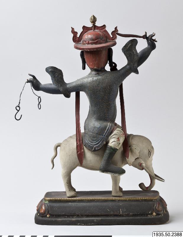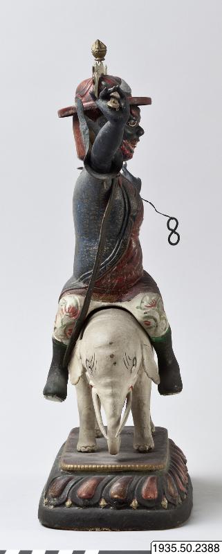 sana: Rider gränsle på vit elefant stående på enkel lotussockel i svartgrönt med röda kronblad och en brunröd (ursprungligen sannollikt mörkröd) ovansida.