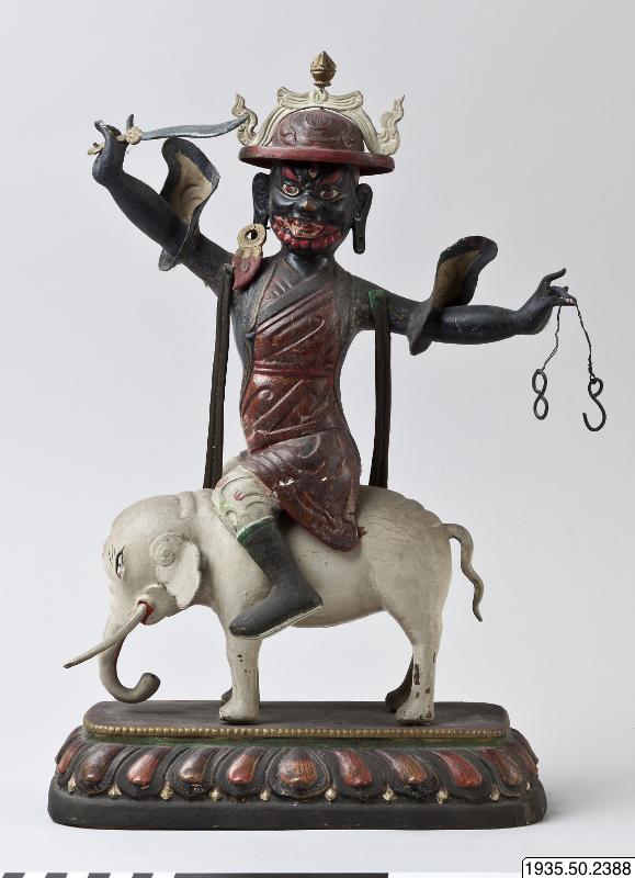 sana: Rider gränsle på vit elefant stående på enkel lotussockel i svartgrönt med röda kronblad och en brunröd (ursprungligen sannollikt mörkröd) ovansida.