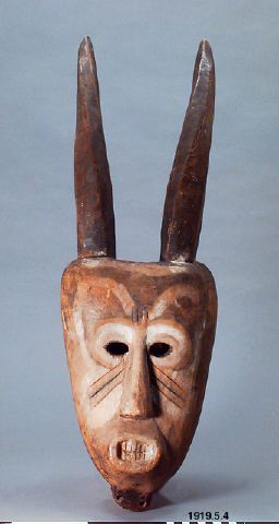 - Två vridna horn, lätt bakåtlutande. Masken är målad i mönster med färgerna vitt, röt ockragult. Ögonhålen runda. Munnen är markerad med relief och har tänder, men masken är ej genomborrad i denna punkt. Tre sneda "ärr"-snitt på ömse sidor om näsroten. Fyra snitt mellan ögonbrynen. Tre snitt på vardera tinningen. Hakan har ett litet utskott med två hål borrade. För skägg? På maskens baksida har urholkningen en 2,5 cm. hög fot, genom vilken 8 snedställda hål är borrade. Höjd:(exkl. horn) 32 cm. Bredd över pannan: 21 cm. Hornen 33 cm. höga. Kamerun