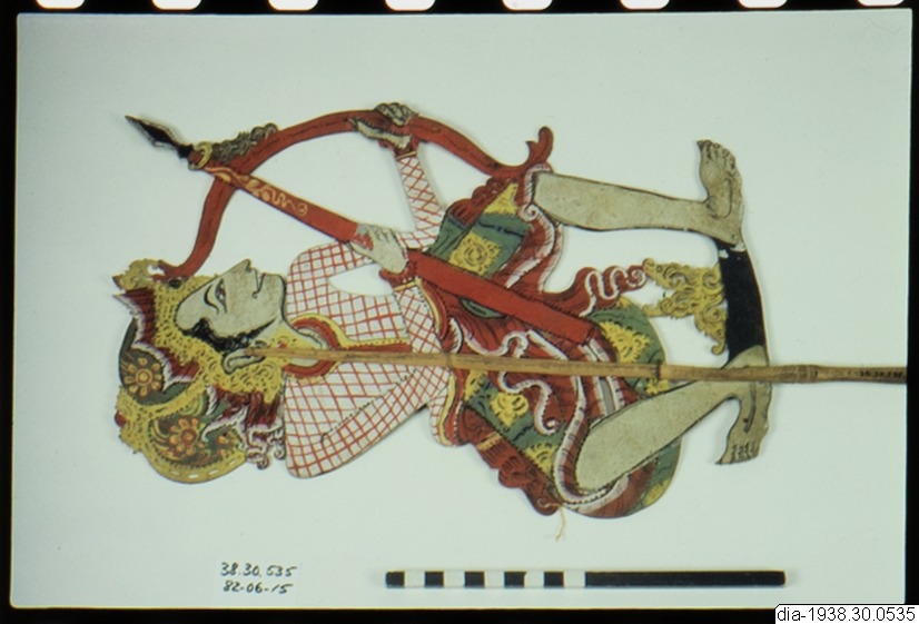 Skuggspelsdocka av ogarvat läder, från ko eller vattenbuffel. Dockan är monterad i en trästav som kluvits ca två tredjedelar av sin längd, den okluvna delen av staven fungerar som handtag. Dockan har inga rörliga delar.