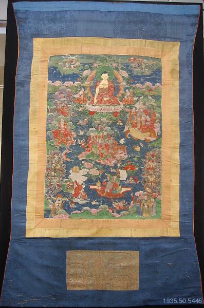 "Lamaistisk tempelmålning, t´angka. Ett slags Sakyamuni-mandala. Förgylld Buddha, fyra himmelskonungar, 18 lohans etc. Sällsynt högklassig, men något bruten i färgytorna. Har i många år hängt i Hedins matsal."/MLK
