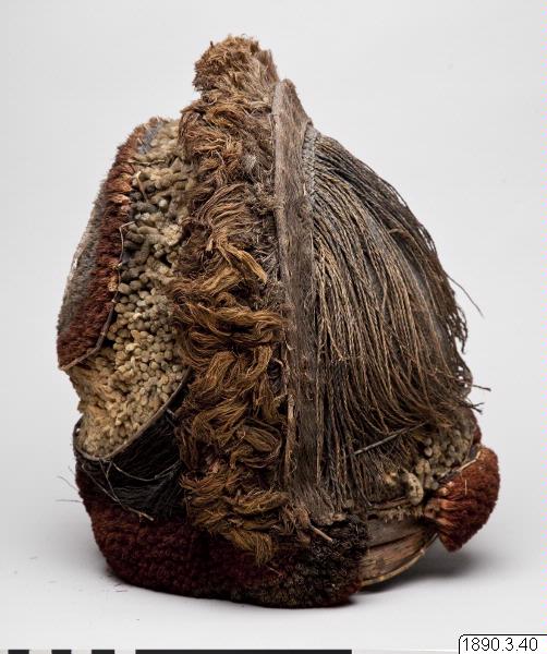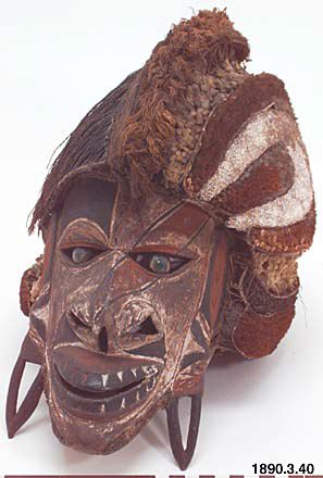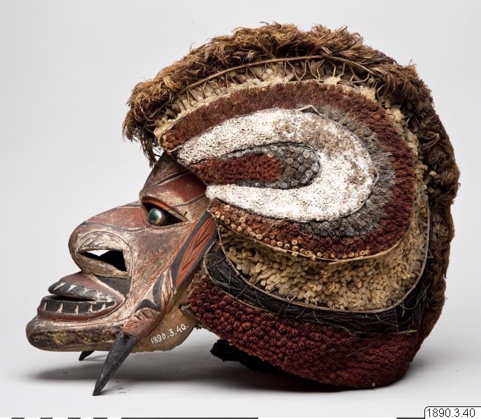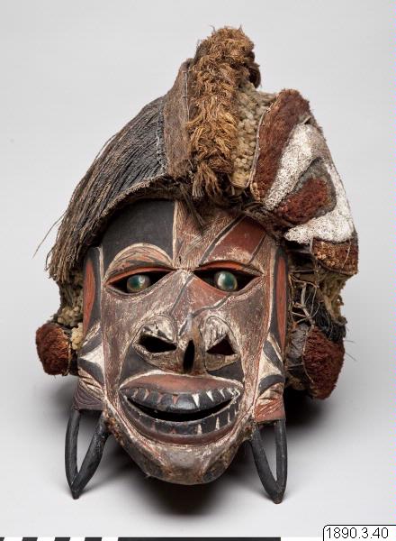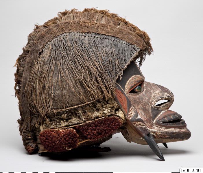 - malangan mask, mask. Dansmask (generalkatalogen). Hjälmmask, assymetrisk. Höger: borst, kalk. Vänster: flätat hår, långsmalt ansikte med rund haka. Se Brenda Clay angående dans. Masken målad i vitt, rött, svart. (enligt Regius, Hélena).