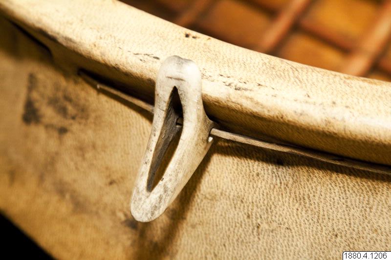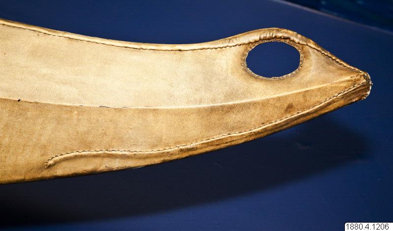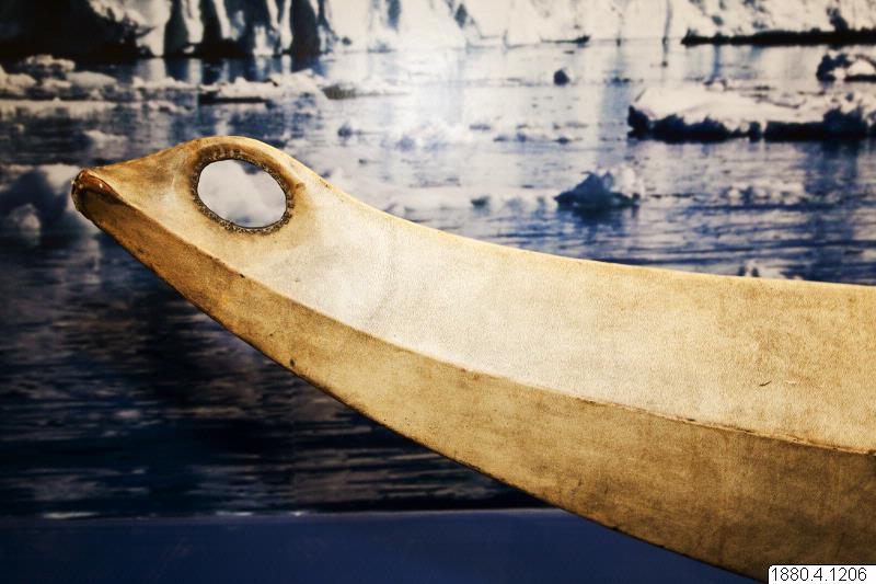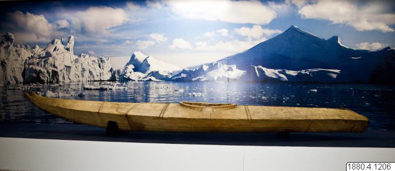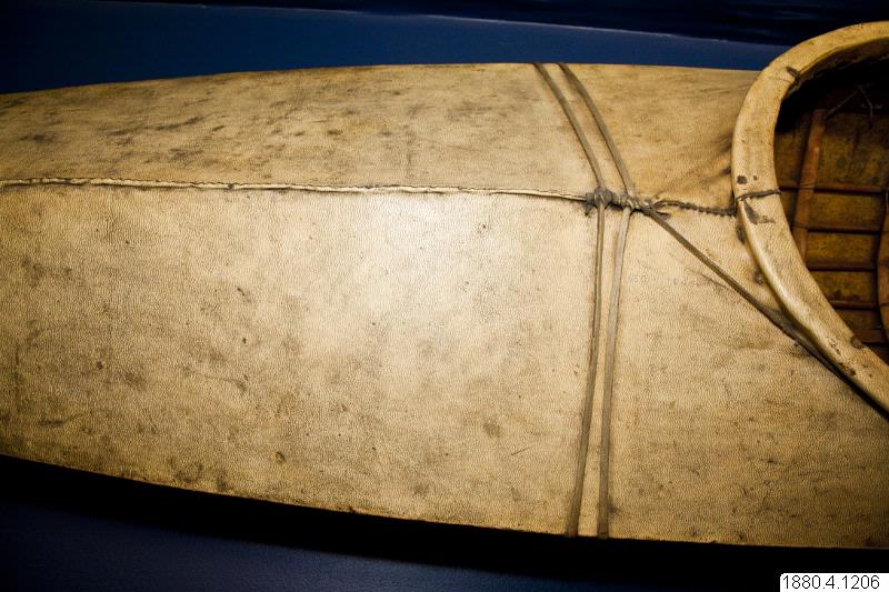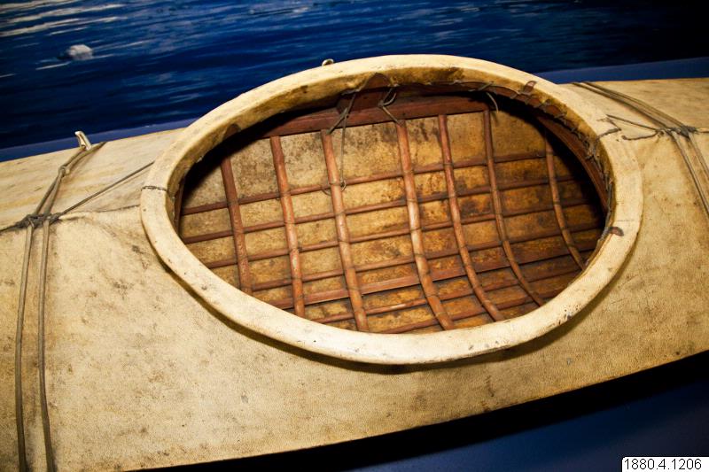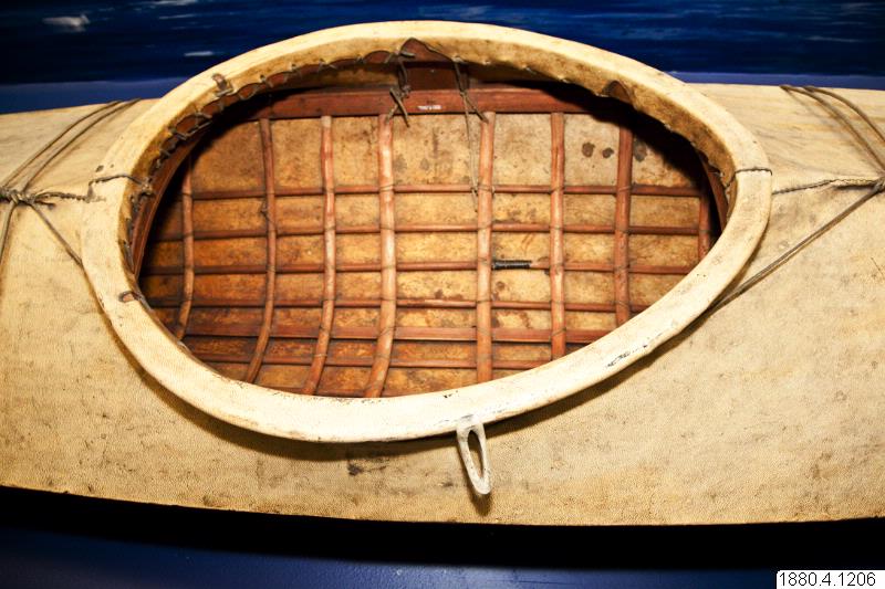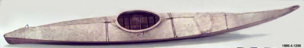 Kajak. Brunt sällskinnstäcke över skelett av trä. Däcket … bottnen… I fören ett genomgående, runt hål ("ögon"). Manhålet ovalformigt och kantat. I manhålet en "modell-eskimå". På sidorna om detta hål små benpluggar, utskurna delvis som djur – (björn-) huvuden, delvis ornerade med inristningar. Pluggarna stöd till jaktredskap. (generalkatalogen)
