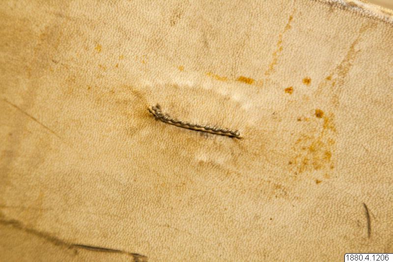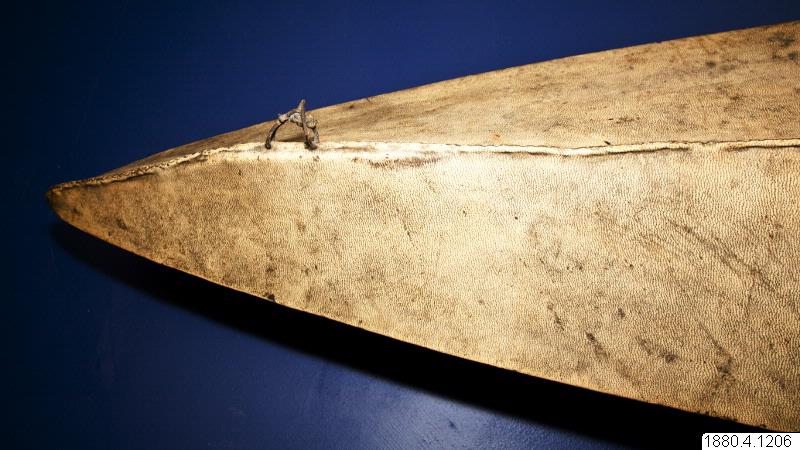 Framför hålet en kajakstol som nr. 1207 med hoprullad harpunlina, på spetsen en harpunspets (som nr. 1087), harpunblåsa (nr. 1088) med munstycke och "amulett-stängsel" med snastofs, bärrem (se 1054), lans med stenspets (se 1127- 28), fågelspjut med fyra spetsar (se 1147), kastträ (nr i orig. kat.4952 eller 4953, se 1142 - 43), båtshake (se 1208), harpunlans med fastsatt förskaft av ben och spetsblad av järn, bunt av brunt skinn med jaktredskap av ben (sårpluggar etc, sannolikt inte från Port Clarence), brunt skinnstycke (lika), tvåbladig paddel (inte Port Clarence) samt en överplagg av sältarm (se 1004) till eskimåmomodellen. (nr. i orig, kat. ett av 5128 - 30). Längd: 470 cm. Bredd: 70 cm. Höjd: ca 35 cm.