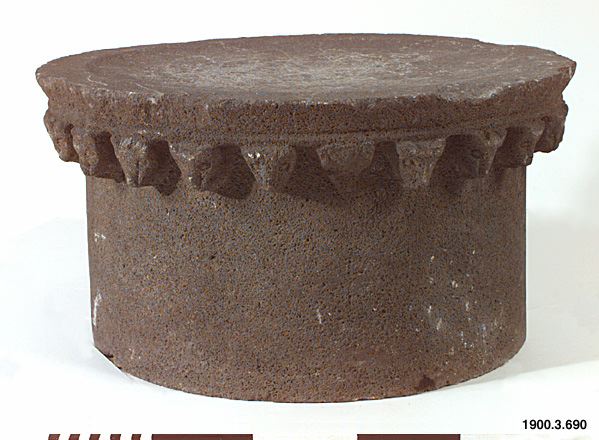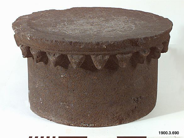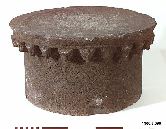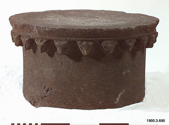 - Stensäte nästan cylinderformat, ornerat med djurhuvuden kring övre kanten. (vestibulen). (Orig.nr, 19 116) Atlantkusten Costa Rica. (generalkatalogen)