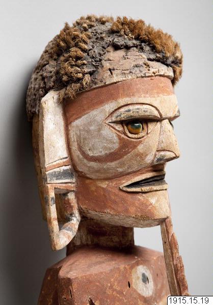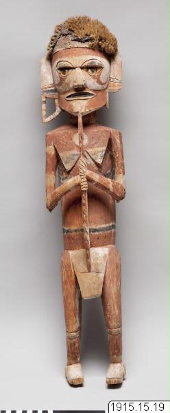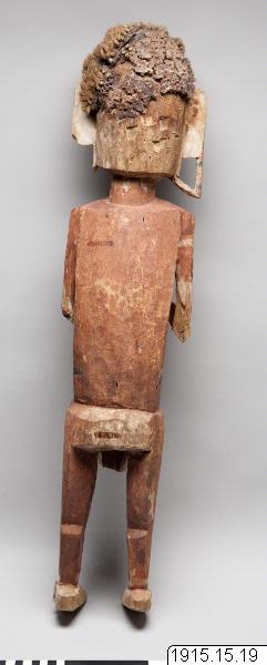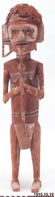 Kulibuskulptur i rött, svart och vitt, utan påle nertill, med vinkelböjda armar och hår av kokosfiber. Bemålad även på ryggsidan. Från armbågarna har vertikala stänger (nu försvunna) utgått ned till de yttre fotknölarna. Från hakspetsen utgår en likaledes vertikal stång ned till den övre delen av ett stort kort klädesskört. Denna stång löper mellan händerna, med vilka den är skulpterad i ett stycke. Alla fingrarna omsluter tätt stången som är försedd med uppåtriktade, hullingliknande utskärningar (eller möjligen blad?) Dessa är rödmålade, under det att den övriga delen av stången tycks ha varit bemålad med en ljusare färg (vit eller gulaktig), som dock sedermera till största delen fallit bort. Det omtalade skörtet är numera huvudsakligen obemålat, men tycks ha varit försett med dels vit färg (på sidorna och på underkanten), dels någon gulaktig färg. Det liknar alltså den vertikala stången (utom hullingarna på dess framkant).