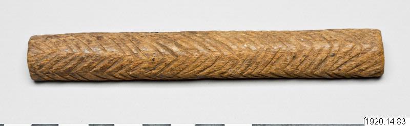 Brevstav. Större än någon av de två föregående. Plan på ena sidan. I genomskärning, alltså närmast halvcirkelformig. Den plana ytan har grunda ränder. Pinnens övriga långsidor har ett sammanhängande fiskbensmönster, alltså sicksacklinjer på tvären. Längd 13,2 cm,. Största tjocklek 1,7 cm, Queensland Australien