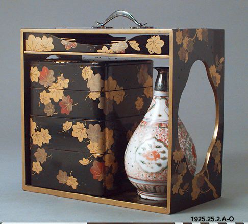 Matsäcksställ av lackerat (maki-e) trä, porslin och metall; ställning innehållande fyra över varandra ställda lådor, den översta med lock; bricka med fem småtallrikar och sake-skål samt sake-flaska med halsen silverbeslagen.