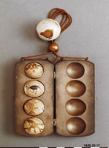 Inro with hinges on the side; exterior gold, black and red lacquer, interior silver lacquer. On one side rooster, on other hen. Internal holes for four loose eggs, each egg in two parts, of white, black and gold lacquer. Insect and plant motifs on the eggs.
