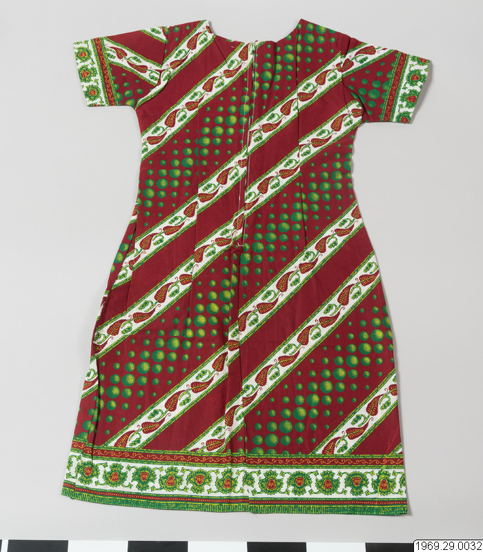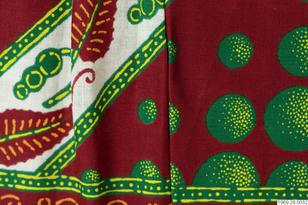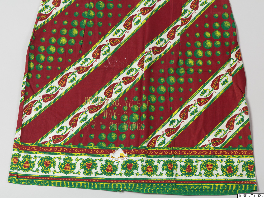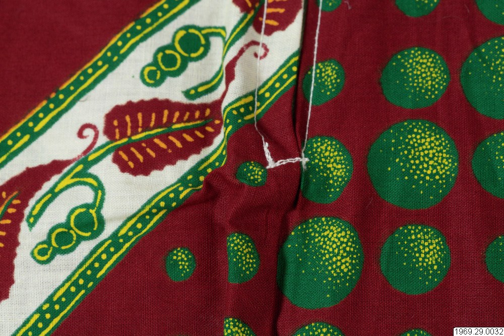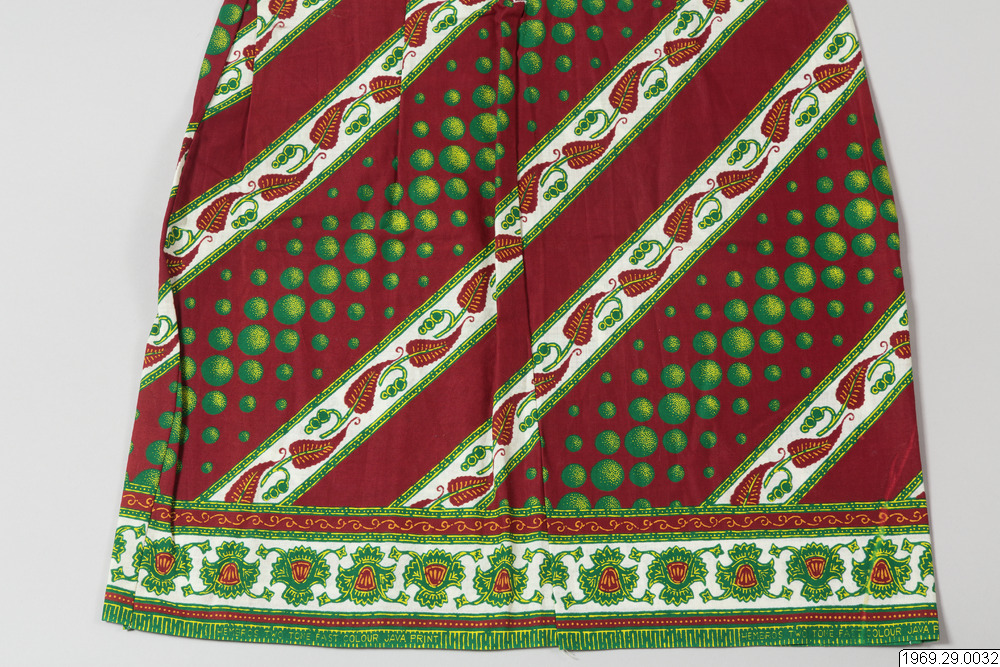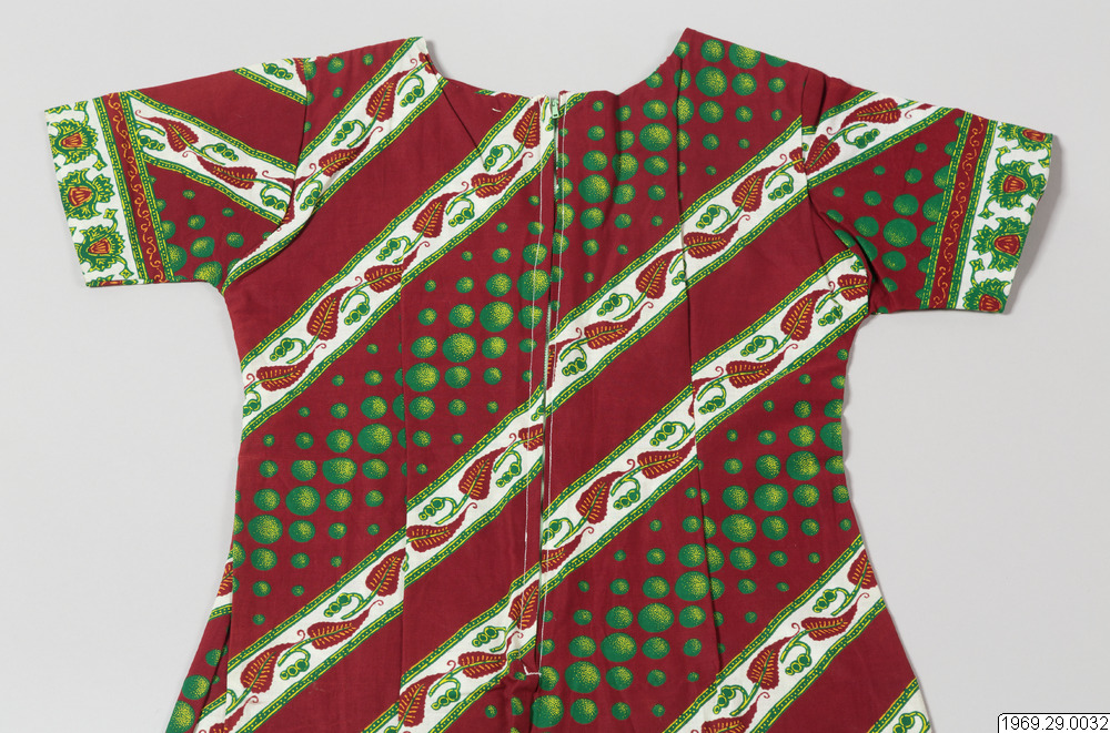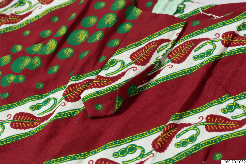 - Enligt generalkatalogen: Klänning, av chiteng-mönstrat tyg: "Hembros two tone fast colour Java print". Inköpt i Kasama. Längd: 190cm.