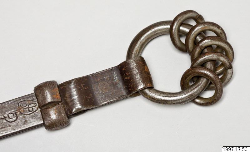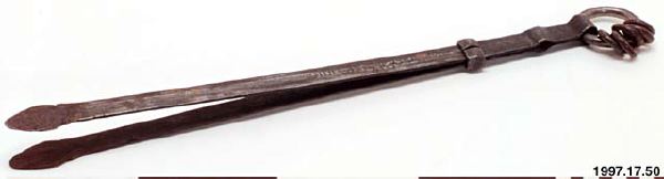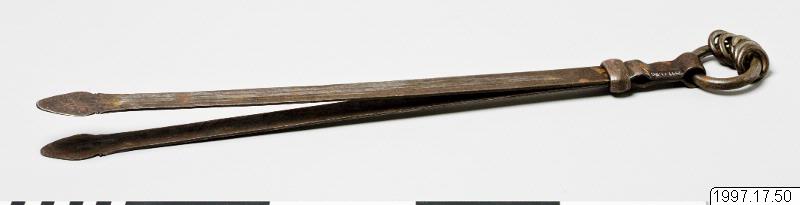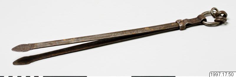 Eldtång med vidhängande ringar. Metall. (enligt kortregister). Eldtänger av denna typ används för att hantera heliga eldar som görs som en slags offerhandling för hinduiska gudomar. Även elden i sig kan förkroppsliga gudomar. De börs av heliga män, sannyasis. Idag är användandet vanligt inom Nathsekten.