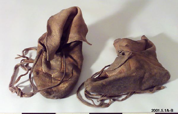 - ett par mockasiner, stor storlek, utan dekoration, tämligen höga skaft-skyddar smalbenet, mjuk "sula"", skinnsnöre för att dra åt kring ankeln