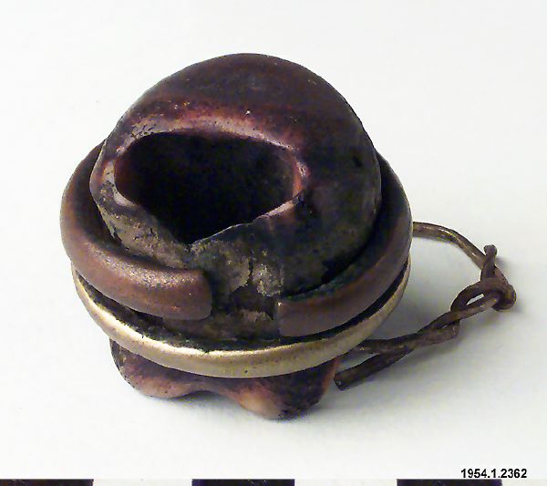 "Fetisch bestående av en ryggkota av leopard? omlindad med kopparring och en mässingsring".(generalkatalogen)