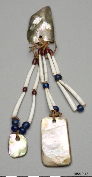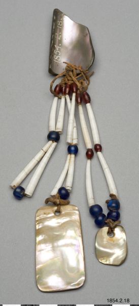 Öronprydnader av tandsnäckan, dentalium, pärlor och slipade pärlemorstycken (generalkatalogen).