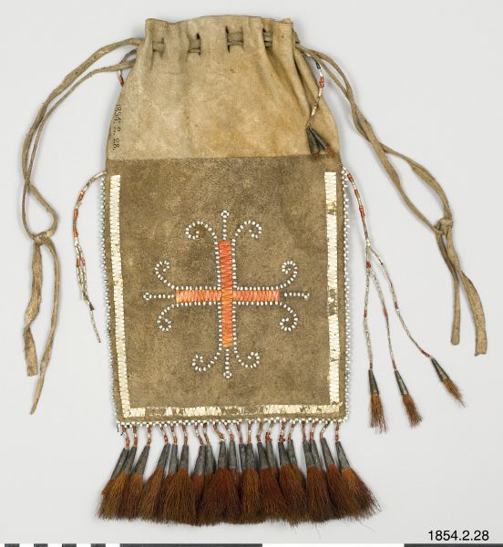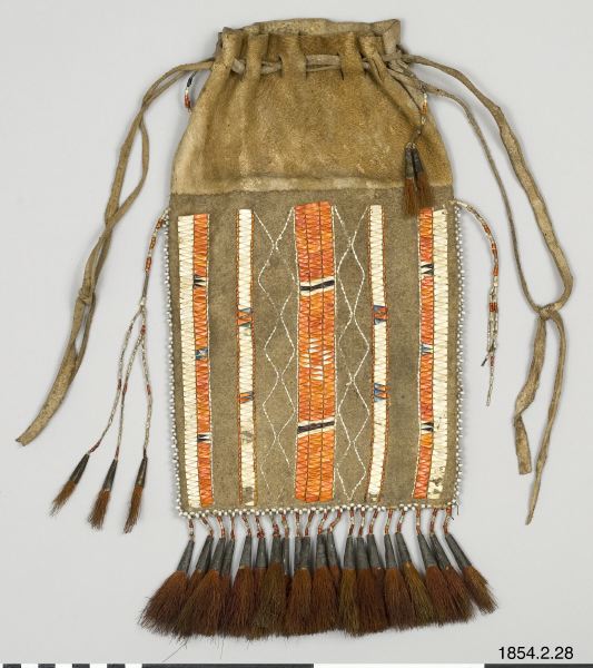 Skinnväska med snörband, broderad med pärlor och erethizontaggar och kantad med röda hårtofsar och bläckhylsor (generalkatalogen).