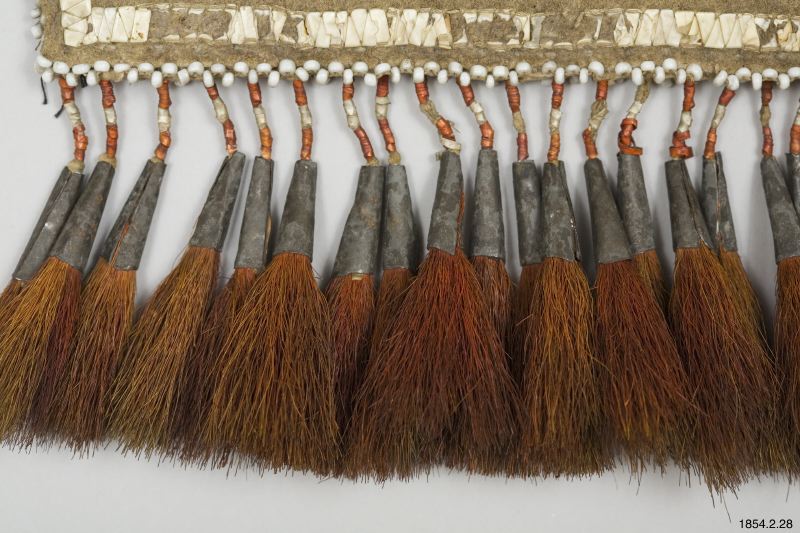 Wrangels förteckning: "En indiansk patrontaska [en större patronväska], som de hava vid sidan i fält att förvara krut och kulor uti. De små strängar som hänga vid denna och pipan kallas av indianerna wampum, vilka ej allenast nyttjas som ornamenter på deras kläder utan även i längre strängar fredsfördrager. Då de under deras tal lämnas till bekräftelse av sanningen vid varje periods slut å ömse sidor, och ingen fred kan slutas utan att dessa å ömse sidor utväxlas. Ju viktigare ärendet anses, ju flera och bredare är dessa strängar som utdelas. De äro därför i handel och vandel med indianerna såsom gångbart mynt och förfärdigas nu mest av europeer av astra [ostron?]skal. Indianerna ha av dessa, wampun alltid, liggande ett stort förråd, att de under krigstid ej må sakna dem. Detta patronkök fick jag av en indiansk agent och överste vid namn Croghan, vilken tagit den av en indiansk konung som blev tillfångatagen vid Ticanderoga på gränsen av Canada år 1759. "
