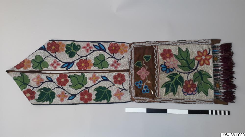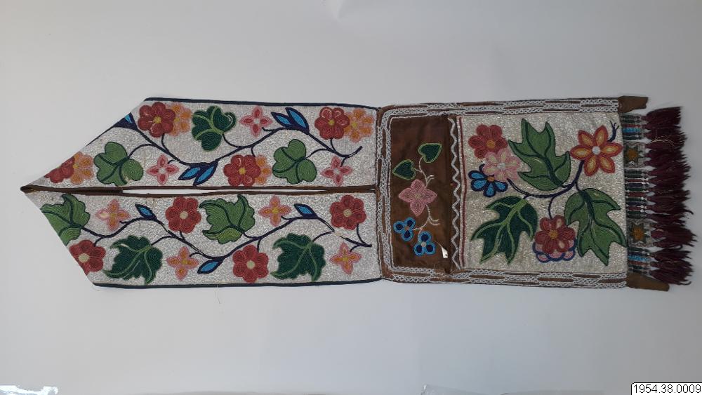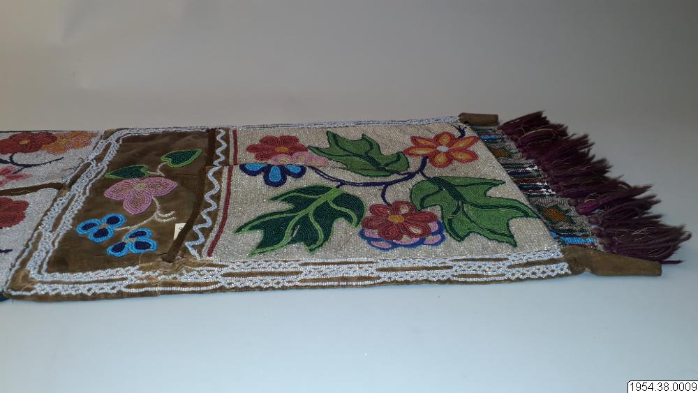 Axelväska. Av tyg med brett bärband. Hela yttersidan nästan helt dold av broderier med glaspärlor i olika färger, föreställande växtmotiv. Nedtill på väskan en trådfrans på flikar med liknande broderier (generalkatalogen).