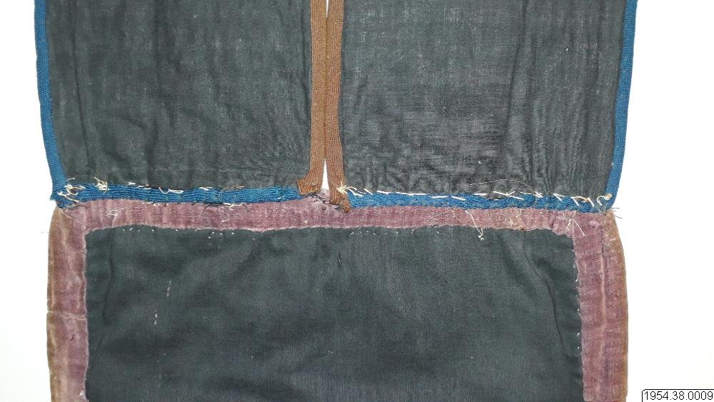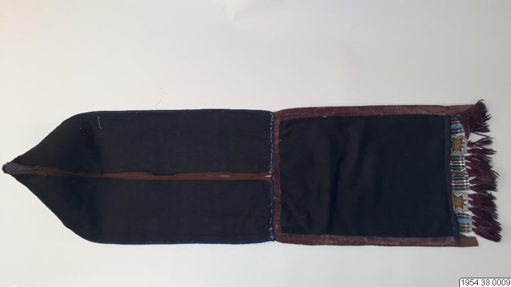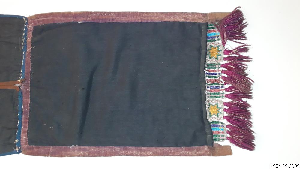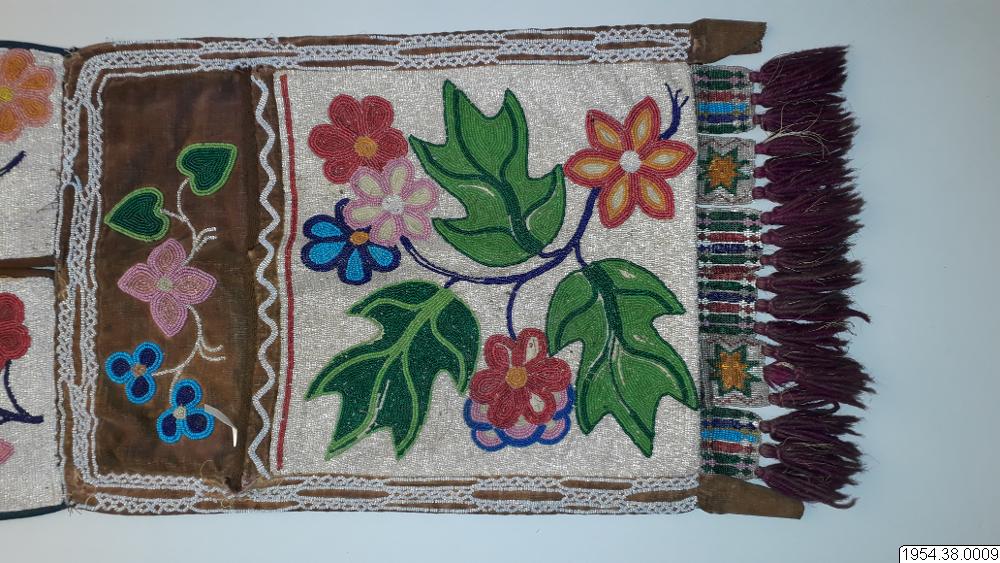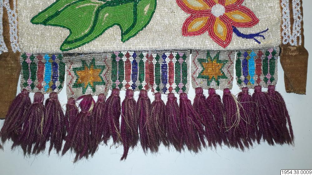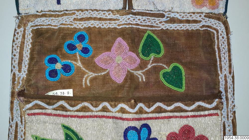 Väskan är av sammet med brett bärband av beige växtfiber. Yttersidan av väskan och bärbandet täckta av broderier av glaspärlor i blommotiv i olika färger på transparent botten. Nedtill flikar 4,5 cm breda och 4 cm långa av pärlbroderi, vardera fliken har tre toffsar av violett ullgarn. Fodrad med svart bomullstyg i tuskaft, nedtill kantad med sammet, bärbandet kantat med band av maskinstickad trikå i brunt och blått.