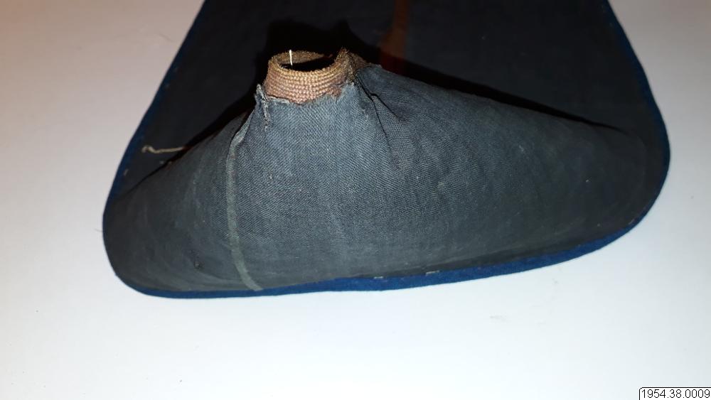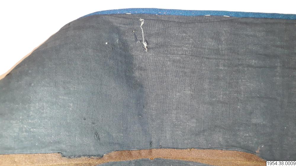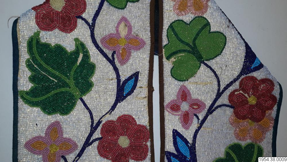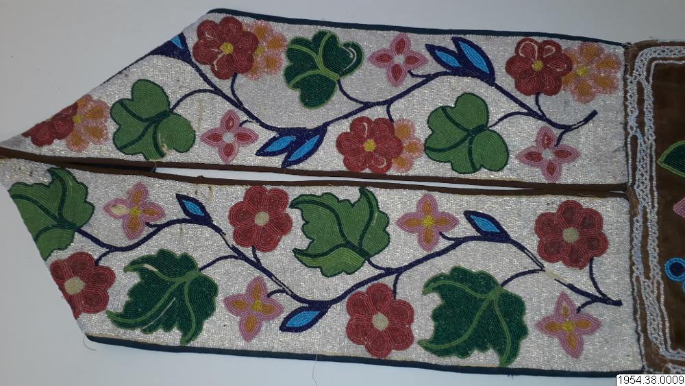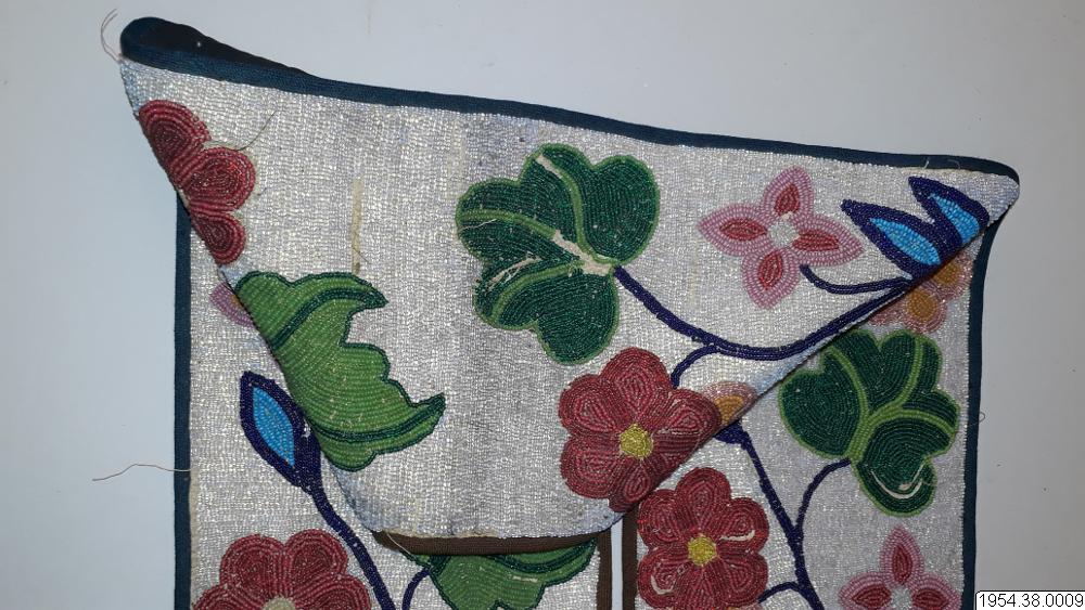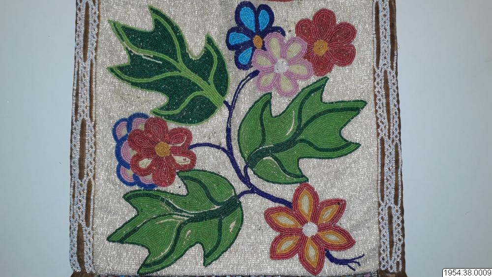 Väskan är av sammet med brett bärband av beige växtfiber. Yttersidan av väskan och bärbandet täckta av broderier av glaspärlor i blommotiv i olika färger på transparent botten. Nedtill flikar 4,5 cm breda och 4 cm långa av pärlbroderi, vardera fliken har tre toffsar av violett ullgarn. Fodrad med svart bomullstyg i tuskaft, nedtill kantad med sammet, bärbandet kantat med band av maskinstickad trikå i brunt och blått.