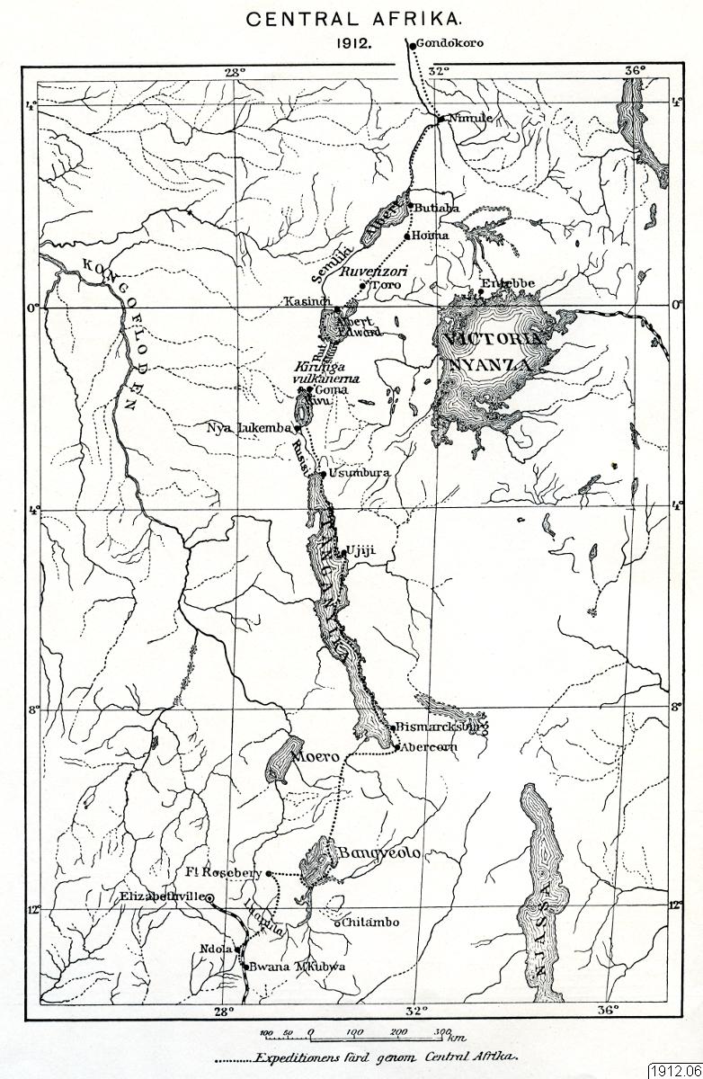 1911-07-20 Kapstaden, avresa mot Viktoriafallen - Livingstone - Broken Hill (Kabwe) - Chirukutus by (balenge) - Bwana Mkubwa - Elisabethville (Lubumbashi )- Bwana Mkubwa - Fort Rosebery - Bangveolo - Usumbura - Kivusjön - Albert-Edwardsjön - Toro (Uganda) - Hoima - Butiaba - Nimulu - Gondokoro (Sydsudan) - Nilen
