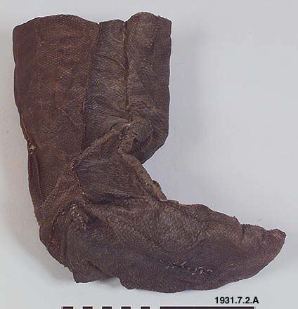 Stövel av hopsydda laxskinn. De används i synnerhet av jägare och fiskare. Ainus begagna som "innerskor" fyllning av gräs under det att japanerna för detta ändamål använder ett slags av bomull förfärdigade sockor - typiskt för ett söderifrån inflyttat folk. Stövlarna är hopskrumpna, men enligt uppgift av givaren kuan de efter att ha uppblötts återformas. (generalkatalogen)