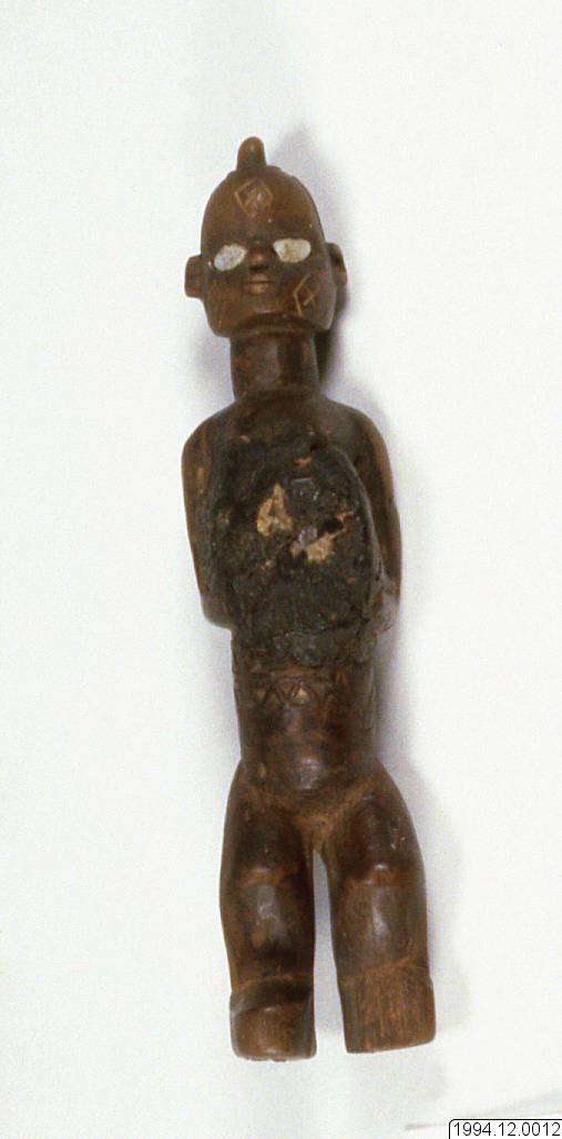 Träskulptur, nkisi, föreställande en kvinnofigur. Ögonen består av porslinsinläggningar. Skulpturen är initierad med bilongo - "magisk subtans"./HTB
