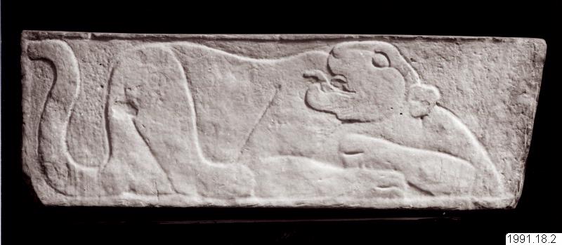 Denna nedre del (på EM internt kallad "jaguarreliefen") av La Amelia Stela 1 (egentligen ett fragment av en större helhet: en stor stele? en väggpanel?, "in situ" välkänd i maya arkeologi: se t.ex. Morley (1938), Proskouriakoff (1950), Freidel et al (1993)) återbördades (eskorterad av museichefen Per Kåks och Amerika-intendenten Staffan Brunius) 1994 till Museo Nacional de Arquelogia e Etnologia, Guatemala City, Guatemala, efter regeringsbeslut (samtidigt som totempålen (se samling 1929....) samma år. Den övre delen (ca 80 % av kalkstensmonumentet, med maya hieroglyfer daterad efter Den Långa Räkningen/Maya Long Count till 810 e.Kr.) finns på sagda museum; de två delarna återförenades. Monumentet hade sågats itu på 1960-talet av plundrare. Den övre delen konfiskerades av Guatemalas myndigheter; den nedre (ca 20%) "prånglades ut" från Guatemala, hamnade hos en "dealer" i NYC, köptes av konstsamlaren Ernest Erickson (bördig från Åland) som donerade/deponerade samlingar på museer i USA, Finland och Sverige. "Jaguarrelifen kom till Nationalmuseum/Statens Konstmuseer i en Erickson-deposition (senare donation) och senare deponerad på EM. Återförandet av "jaguarreliefen presenterades av Staffan Brunius under ICOM-mötet i Stavanger, Norge, 1995. Litt.: se t.ex. S. Brunius, Resan till Guatemala, i EM´s Berättelsen om ett År 1994 (1995); EM´s utställningskatalog Maya det gåtfulla folket (1969); notis om återförandet finns i tidskriften Mexicon. Se även J. Wirgin. The Ernest Erickson Collection in Swedish museums (1989).
