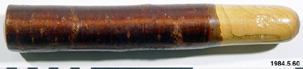 - Trästav av mörkrött trä med ljus topp. Den ljusa änden rundad. Hål borrat tvärs igenom. Enligt generalkatalogen ett cigarettmunstycke i form av en penis.