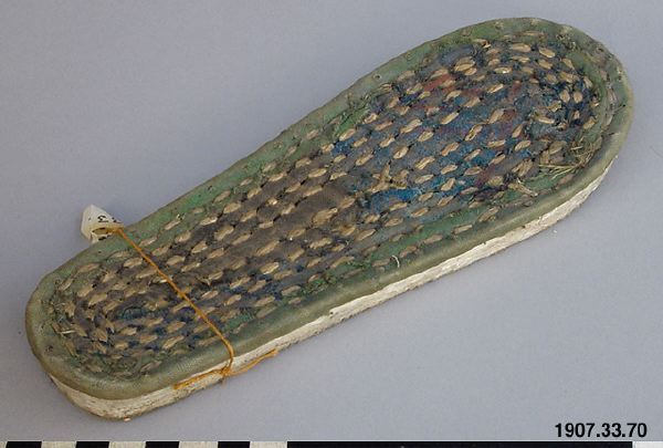 - Sula av blått tyg i tuskaft, med kanter av grönt bomullstyg i tuskaft. Kraftiga sömmar över hela sulan av tvinnat snöre av växtfiber. Sulan är 2 cm tjoch och bemålad med vitt. Undersidan på sulan av gles väv i tuskaft, med kraftiga sömmar av tvinnat snöre av växtfiber.