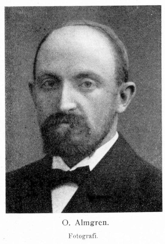 Oscar Almgren, arkeolog. Professor i nordisk och jämförande fornkunskap i Uppsala 1914-1925. A var tvärvetenskapligt orienterad, mot filologi och naturvetenskap. Han utförde betydelsefulla utgrävningar av östsvenska stenåldersboplatser och av bronsåldershögen vid Håga i utkanten av Uppsala. A:s doktorsavhandling om de germanska dräktspännena var banbrytande, liksom hans religons-och kulturhistoriska tolkningar av de nordiska hällristningarna. Han publicerade bl a "Studien über nordeuropäische Fibelformen" (1897), "Kung Björns hög och andra fornlämningar vid Håga" (1905), "Sveriges fasta fornlämningar från hednatiden" (1904, 3:e uppl. 1934) och "Hällristningar och kultbruk" (1927). Far till Bertil Almgren. /US