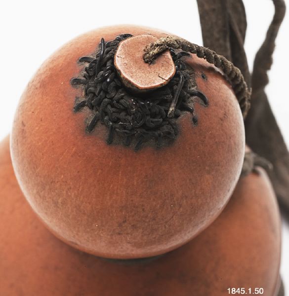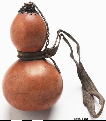 - Enligt generalkatalogen:Snusdosa av kalebass, klotformig, med propp och skinnrem.