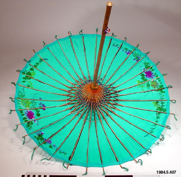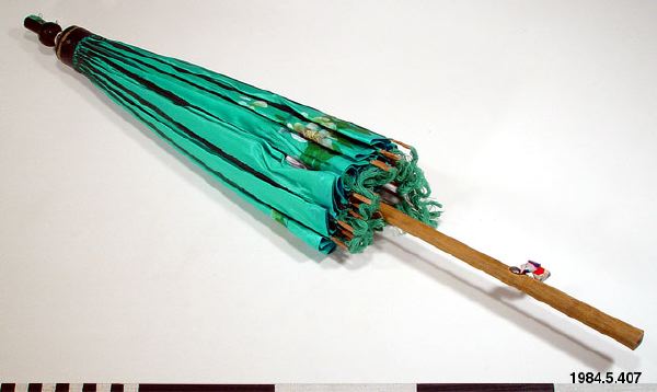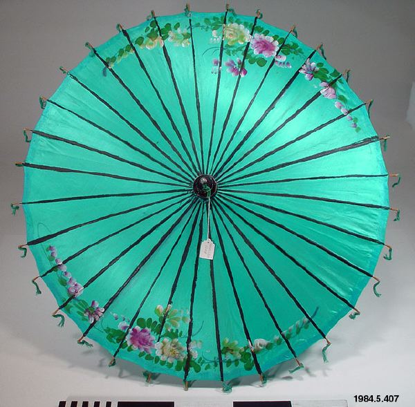 - Parasoll av trä med turkos sidentyg som har målade blommor i rosa, gult, vitt och grönt.