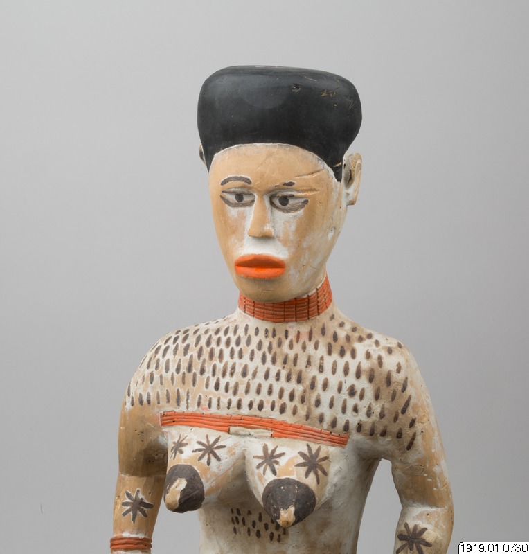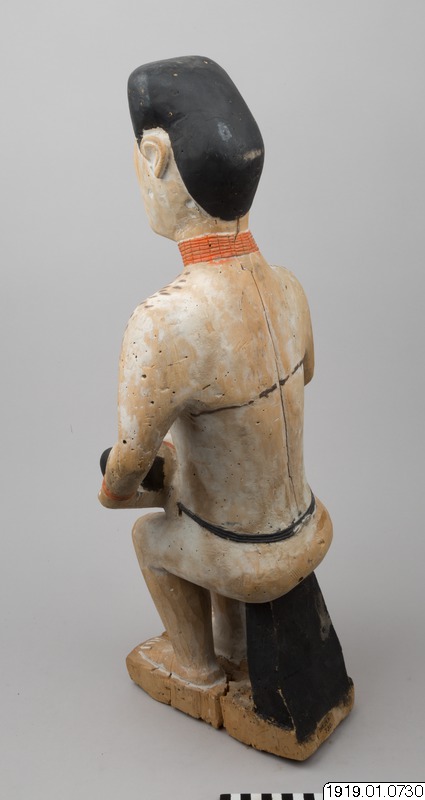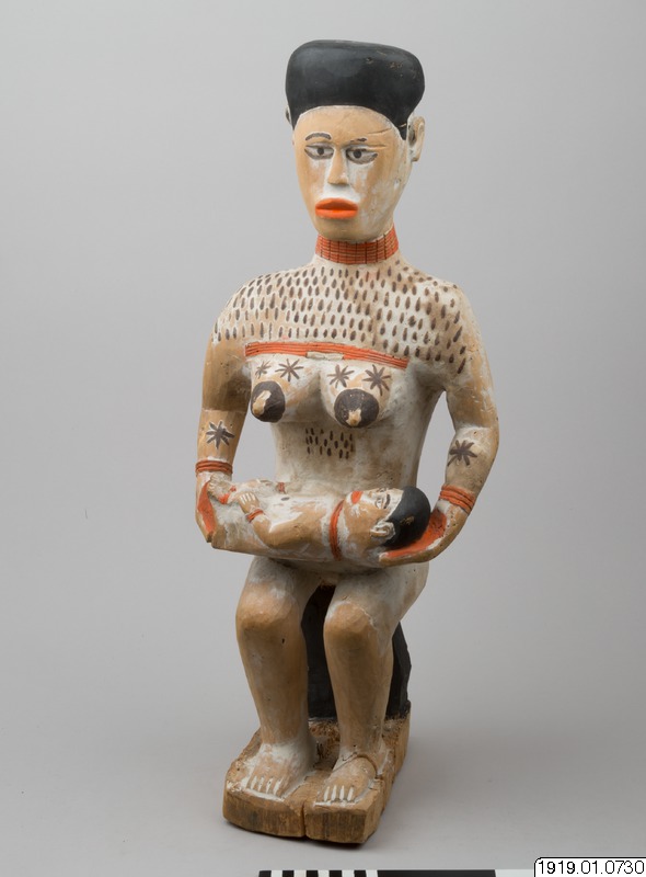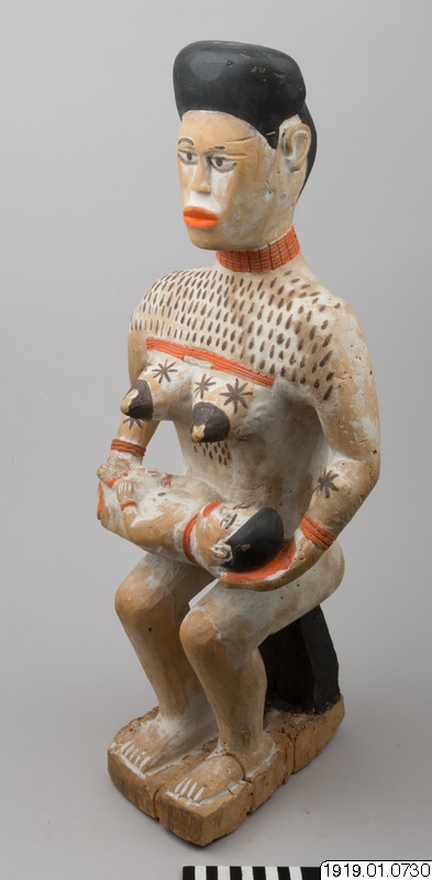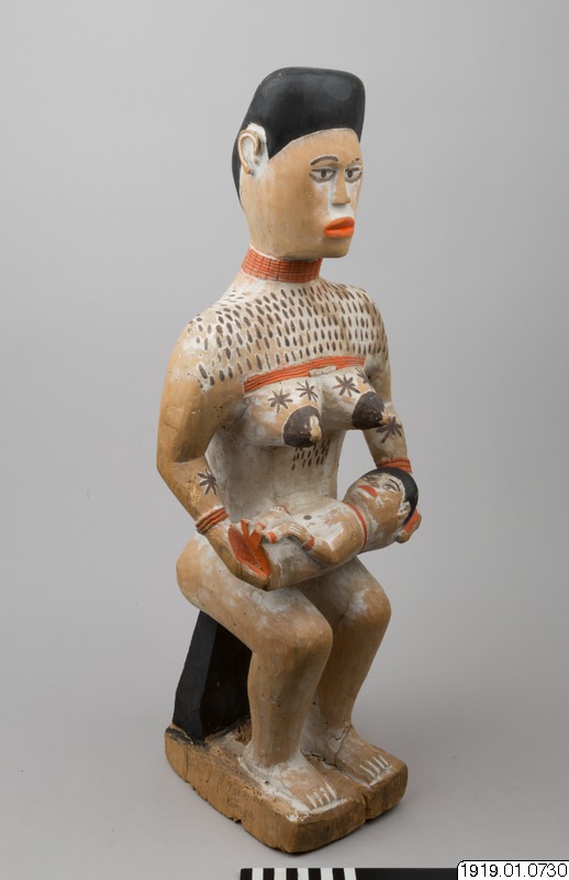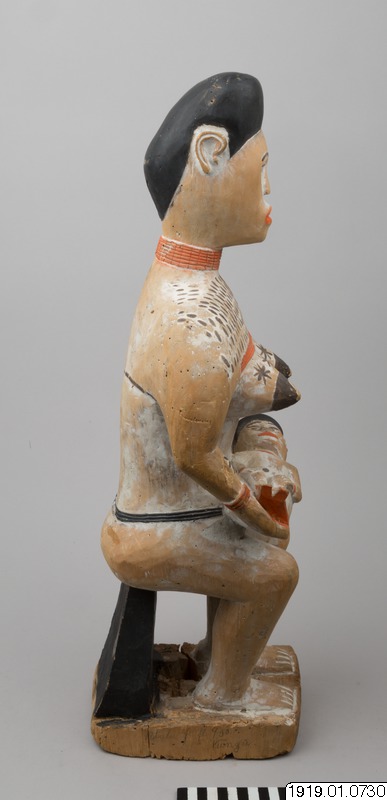 Gravskulptur i lätt trä av sittande kvinna med en barn liggande i sitt knä. Kvinnans kropp är målat i vitt med hår, bröstvårtor och ett band kring midjan i svart. Vitt är ofta färgen för de döda och för sorg. Kvinnans läppar, händer och barnets fötter är målade röda. Både kvinnan och barnet bär också halsringar och armringar i samma röda färg. Ovanför kvinnans bröst är tatueringar målade i form av korta, svarta streck. Tatueringar i form av blommor är målade i svart på kvinnans bröst och underarmar.
