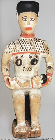Gravskulptur i lätt trä av sittande kvinna med en barn liggande i sitt knä. Kvinnans kropp är målat i vitt med hår, bröstvårtor och ett band kring midjan i svart. Vitt är ofta färgen för de döda och för sorg. Kvinnans läppar, händer och barnets fötter är målade röda. Både kvinnan och barnet bär också halsringar och armringar i samma röda färg. Ovanför kvinnans bröst är tatueringar målade i form av korta, svarta streck. Tatueringar i form av blommor är målade i svart på kvinnans bröst och underarmar.