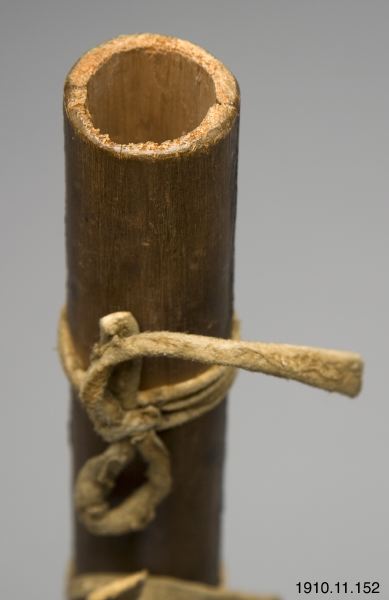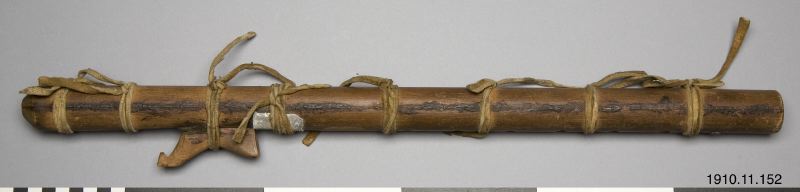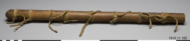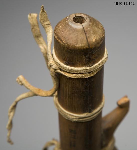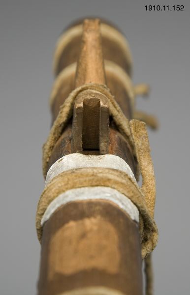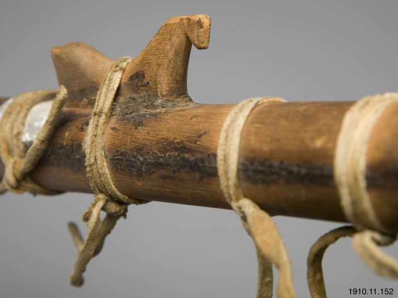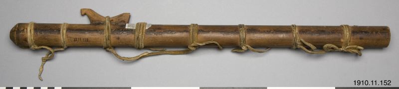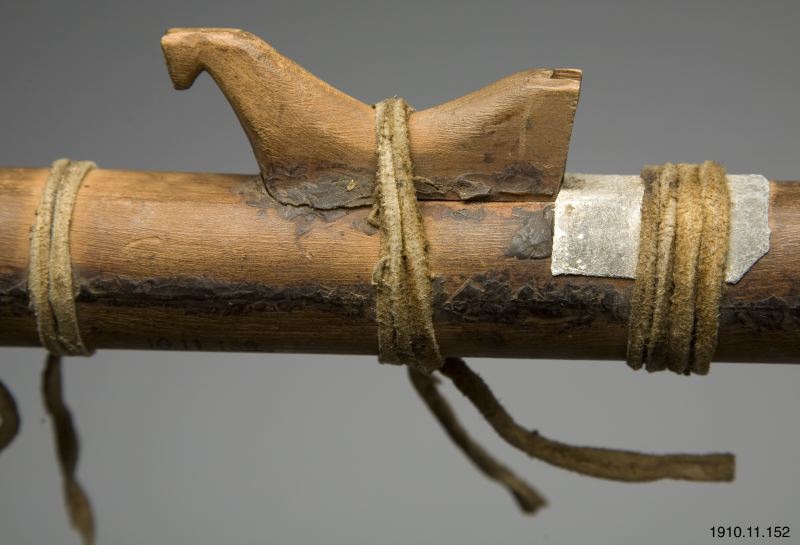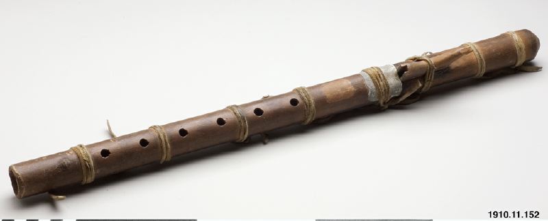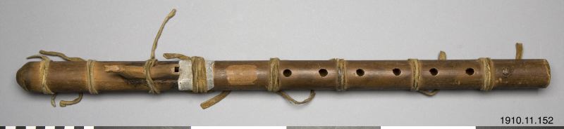 - Flöjt av trä, s.k. flageolett. Ihåligt trä med liten öppning i ena änden, munstycket, större i andra änden. Sex hål för fingrarna, ett sjunde hål är igentäppt med en plugg. På rörets övre ände sitter en hästfigur. På jämna mellanrum är flöjten lindad med läderremmar.