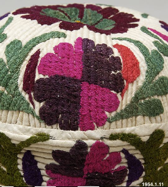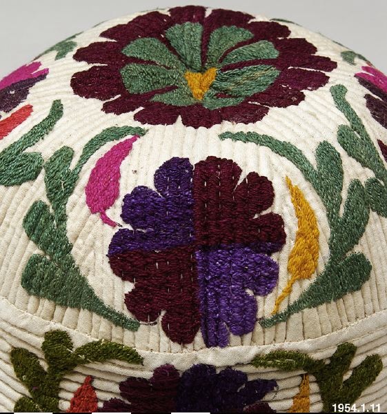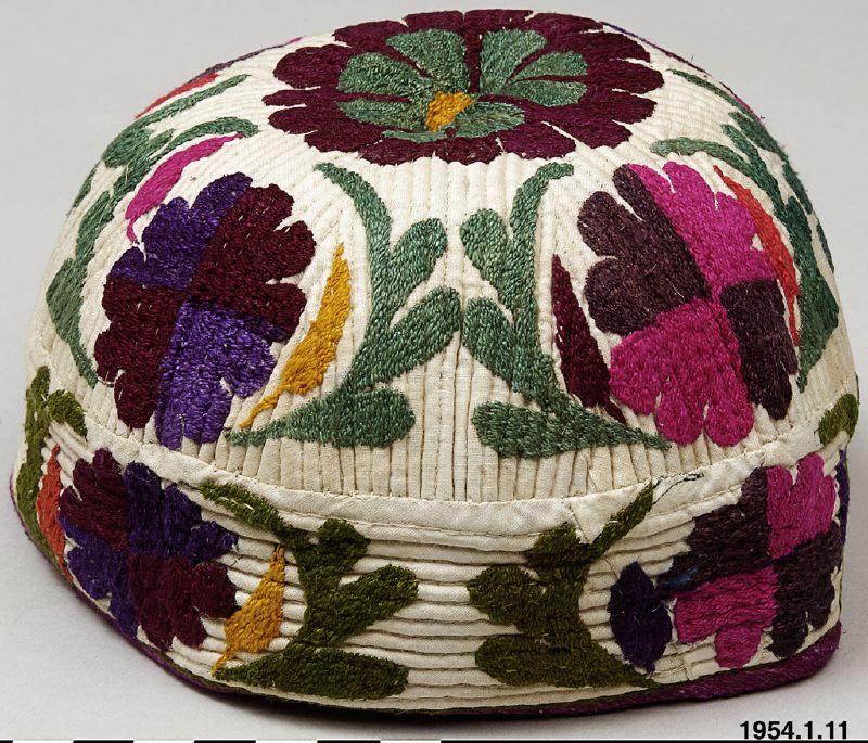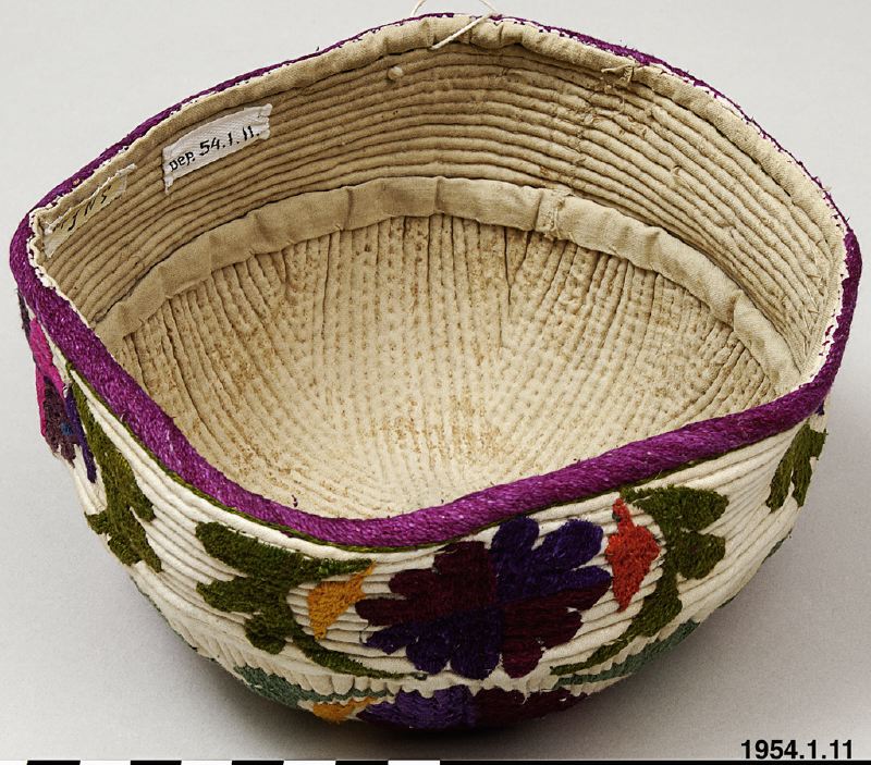 - Mössa av vit bomullsväv i tuskaftsbindning. Hela ytan dekorerad med en qviltsöm och broderade blommor och blad i flera färger.