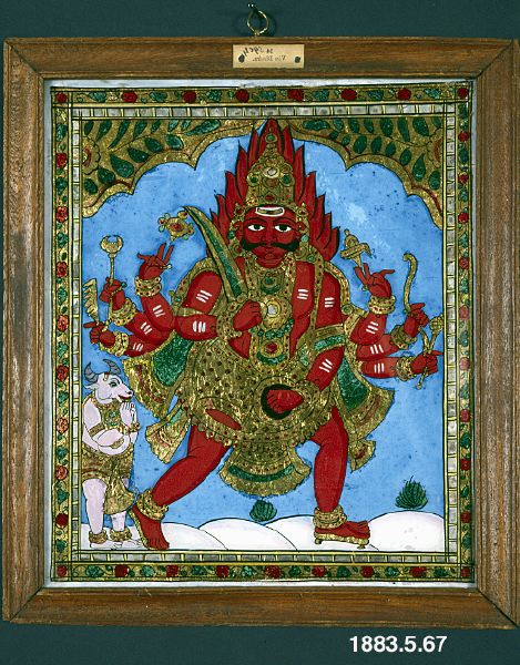 Virabhadra (röd) med åtta armar och shiva-tilak (para-tilaka) i pannan. Bredvid honom står en mycket liten Daksha med gethuvud och shiva-tilak i pannan och med händerna sammanpressade i namaste-gest, som för att tillbedja Shiva.
