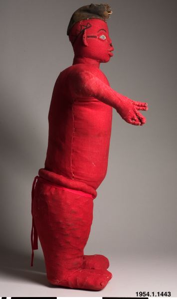 - Stående niombo av rött kypertvävt ylletyg (blekt) med bemålat bomullstyg på huvudet. Rött bomullsband (tuskaft) av senare datum runt midjan. Rester av tidigare dekor på magen?
