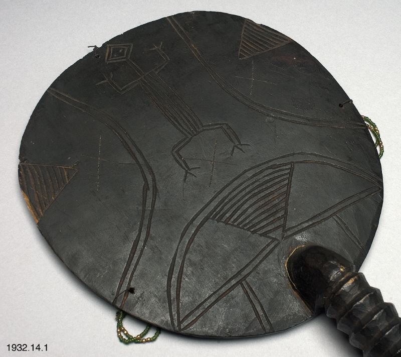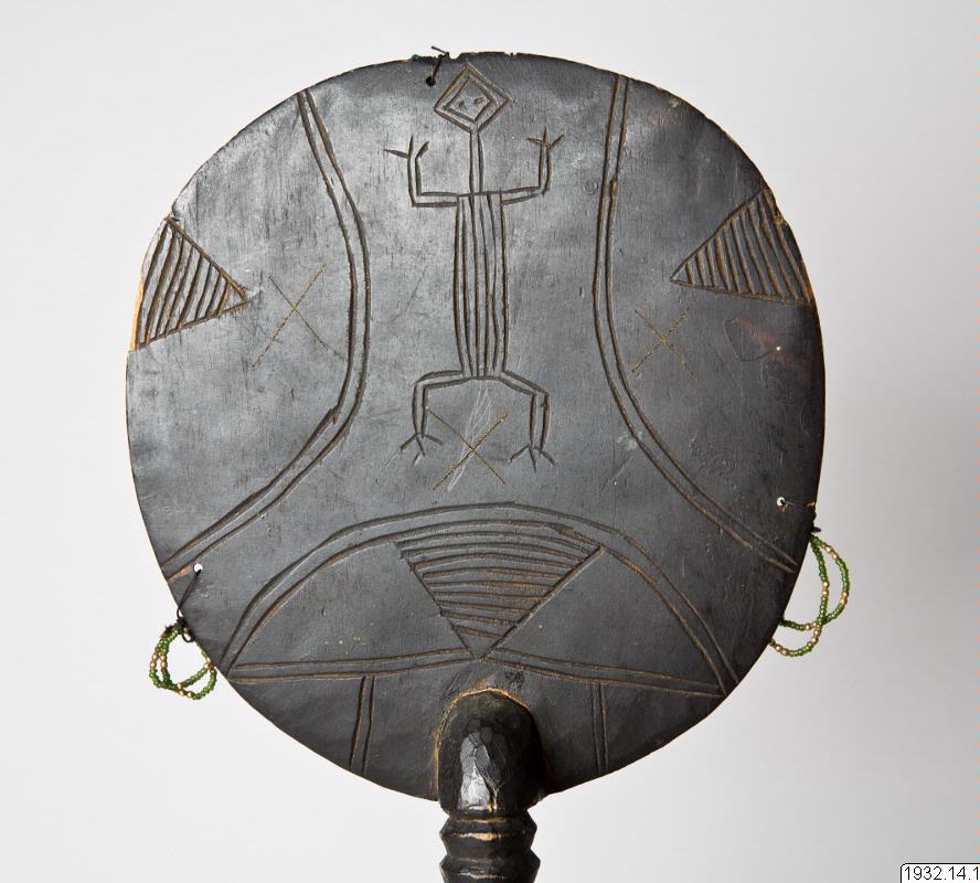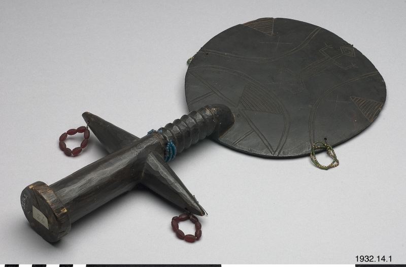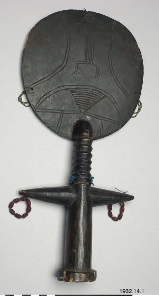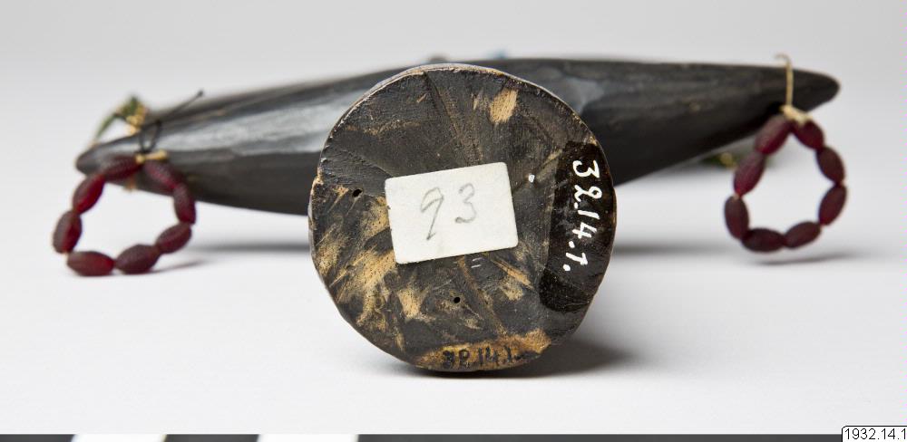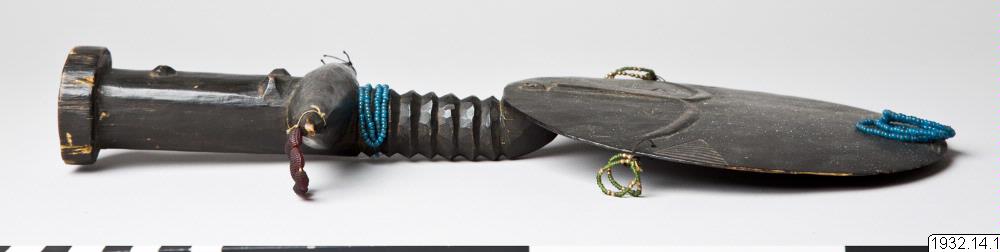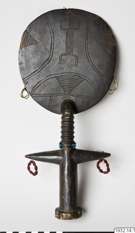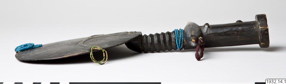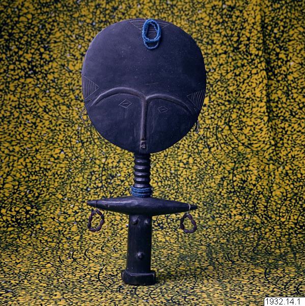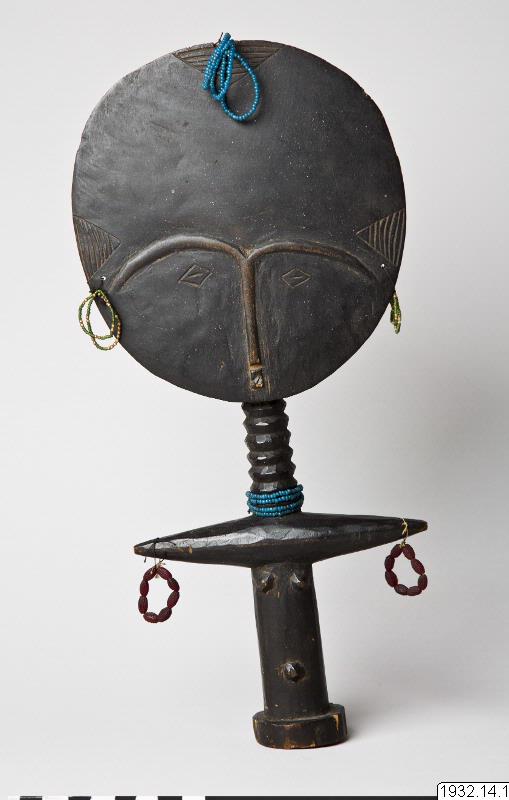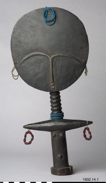Ashanti doll. Svartfärgad. Huvudet är runt och platt, ögonbrynen tydligt markerade. Ögonen rombformade, näsan rakt lodrät, liten mun. Halsen lång och med valkar. (Hälsosamt skinande fettvalkar ingår i akanfolkens skönhetsideal.) Armarna spolformade och vågrät ut från en cylindrisk kropp med bröst och navel markerade. På hjässan, vid öronen, halsen och händerna finns små ringar av pärlor. På huvudets baksida finns ristningar (en stående figur samt trianglar, kryss och bågformer.